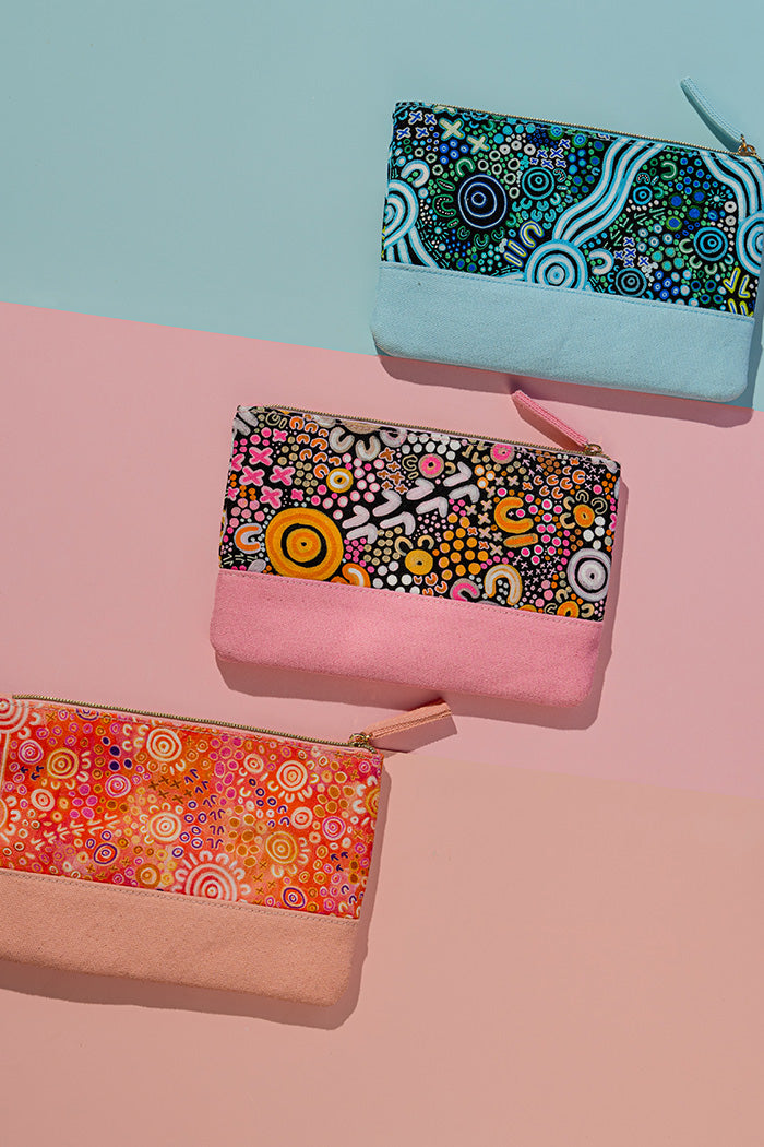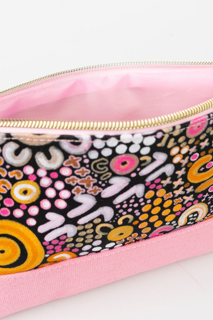 Our brand new line of beauty bags are available in four sizes featuring artworks from the incredible artist Merindah-Gunya. With durable canvas material, a water resistant lining and sturdy metal zippers, these bags are perfect for storage and travel for your beauty products, makeup, toiletries and more! Softly structured and cushioned to protect your valuables.