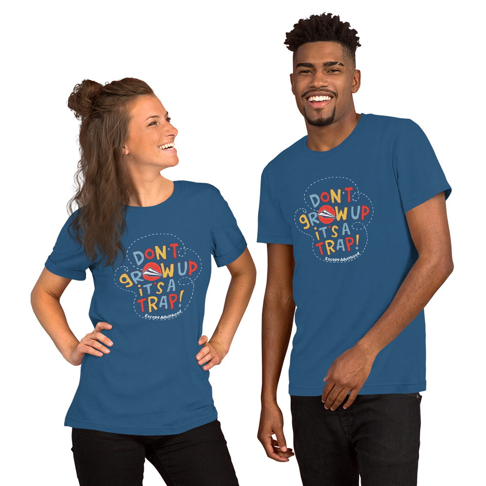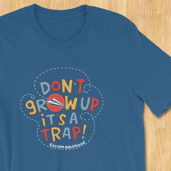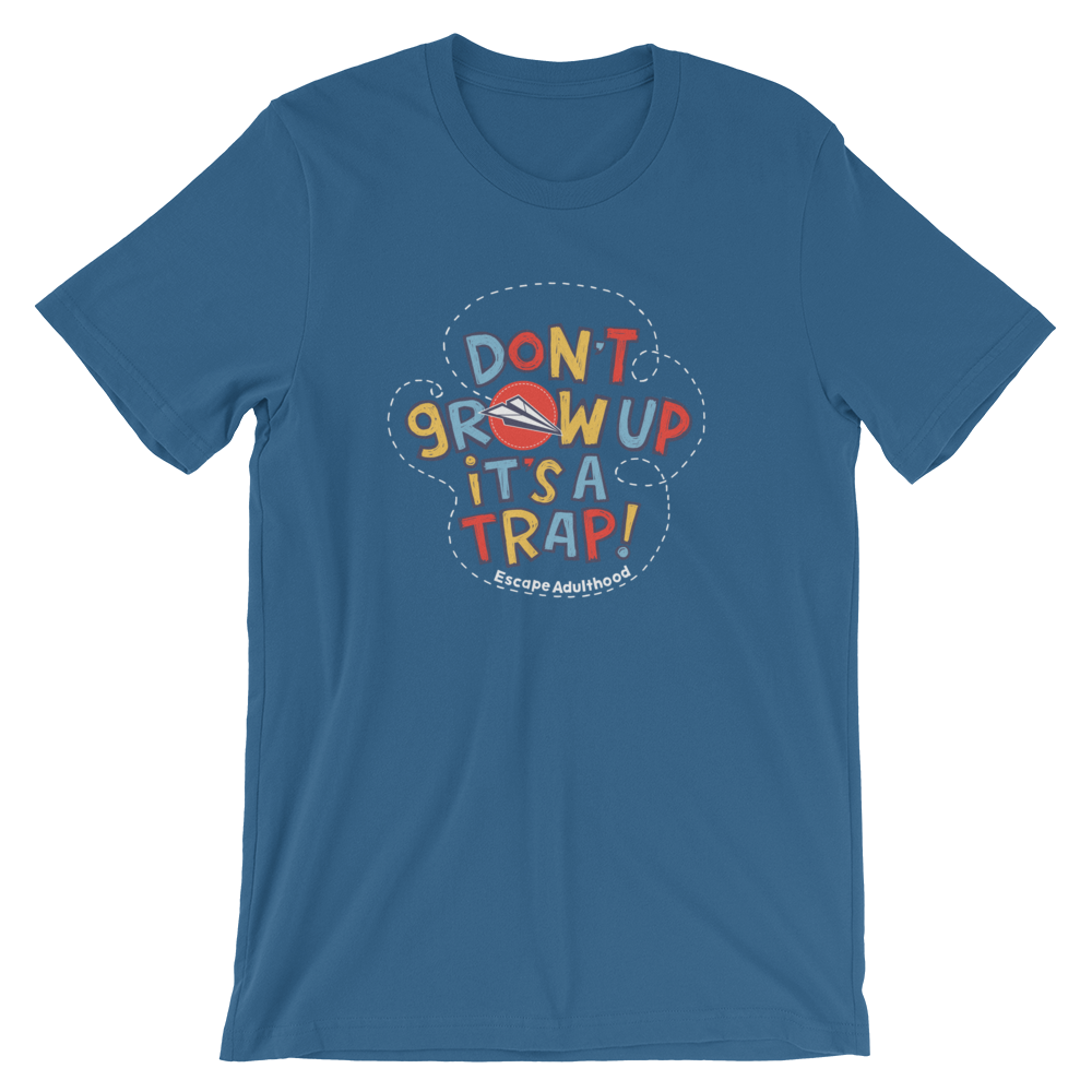 This adulthood thing is not all it's been cracked up to be. In fact, some might consider it a bit of a trap, luring you in with promises of fun and excitement but leaving out the parts about credit card bills, boring meetings, and taking yourself way too seriously. At least with this t-shirt you can warn the others.