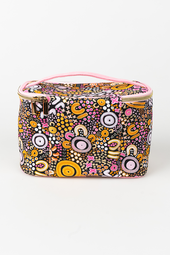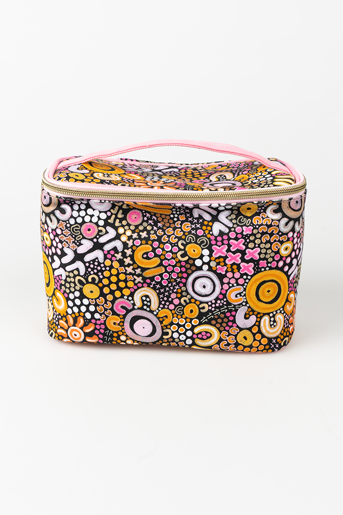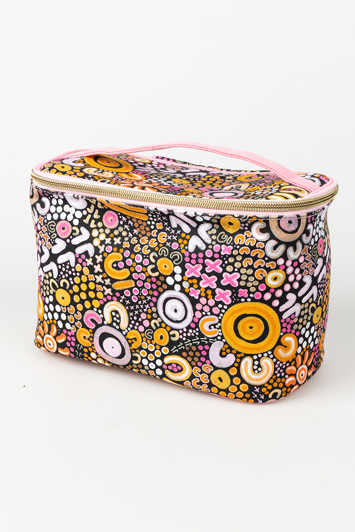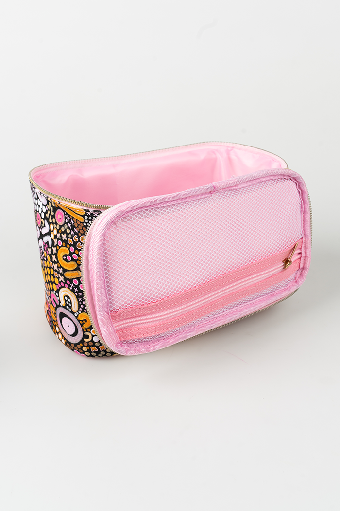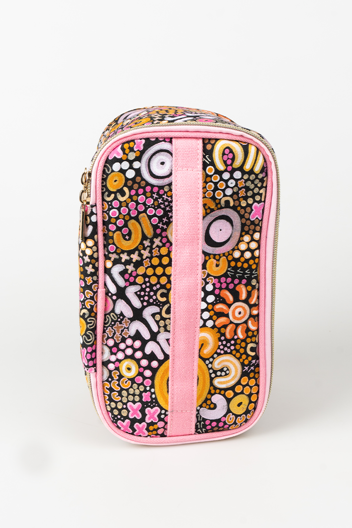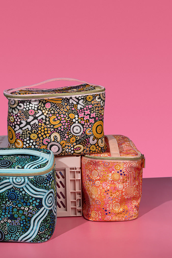 Brighten up your station, bathroom or hotel room with a burst of vibrant First Nations art. Collect the set or mix and match from the three landscape-inspired designs. With storage compartments and a carry handle, these cosmetics bags are both pretty and practical.