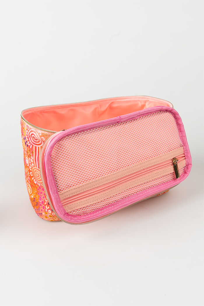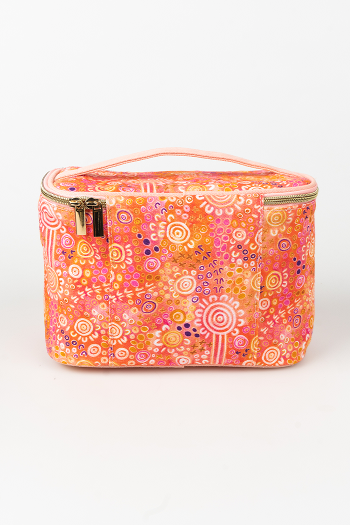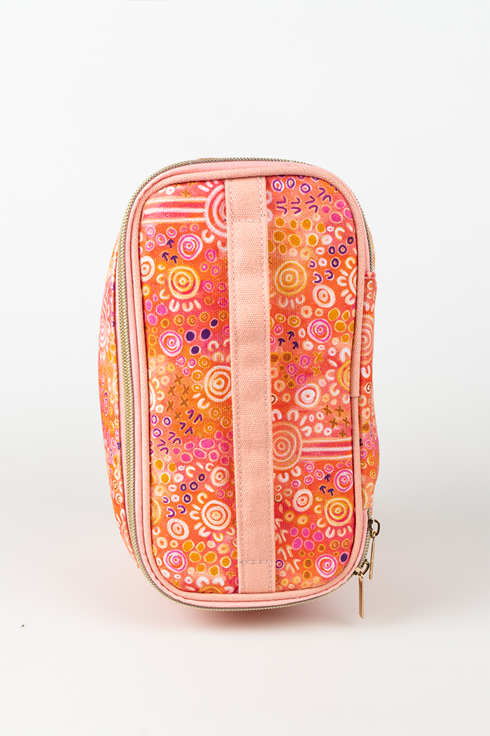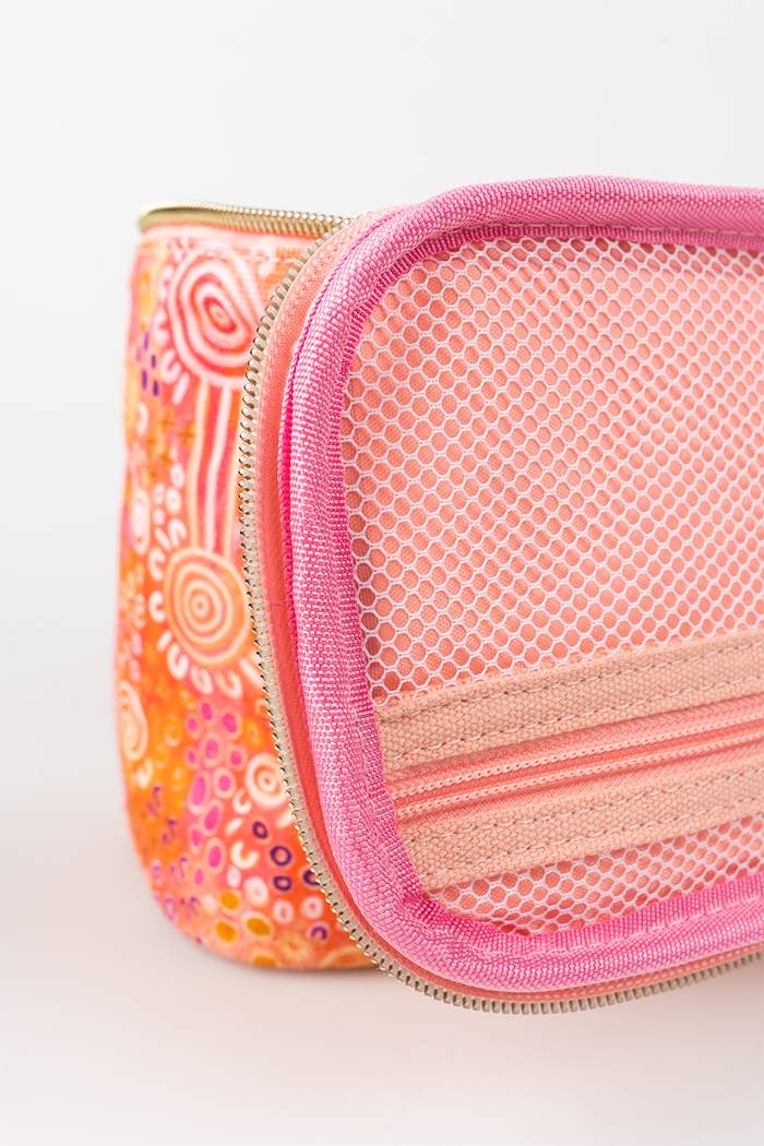 Our brand new line of beauty bags are available in four sizes featuring artworks from the incredible Gundjitmara artist Merindah-Gunya. With durable canvas material, a water resistant lining and sturdy metal zippers, these bags are perfect for storage and travel for your beauty products, makeup, toiletries and more! Softly structured and cushioned to protect your valuables!
