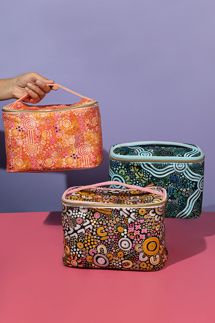 Brighten up your station, bathroom or hotel room with a burst of vibrant First Nations art. Collect the set or mix and match from the three landscape-inspired designs. With storage compartments and a carry handle, these cosmetics bags are both pretty and practical.