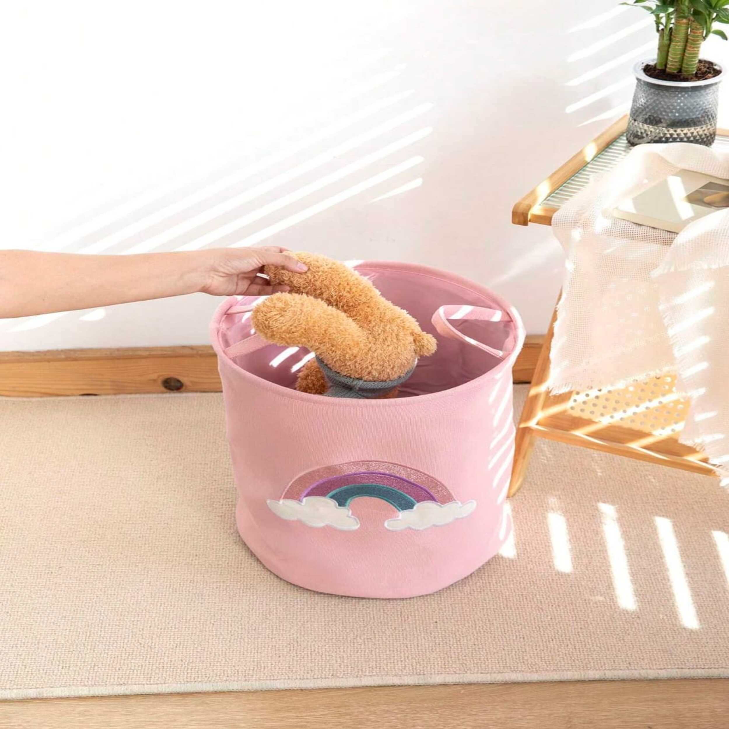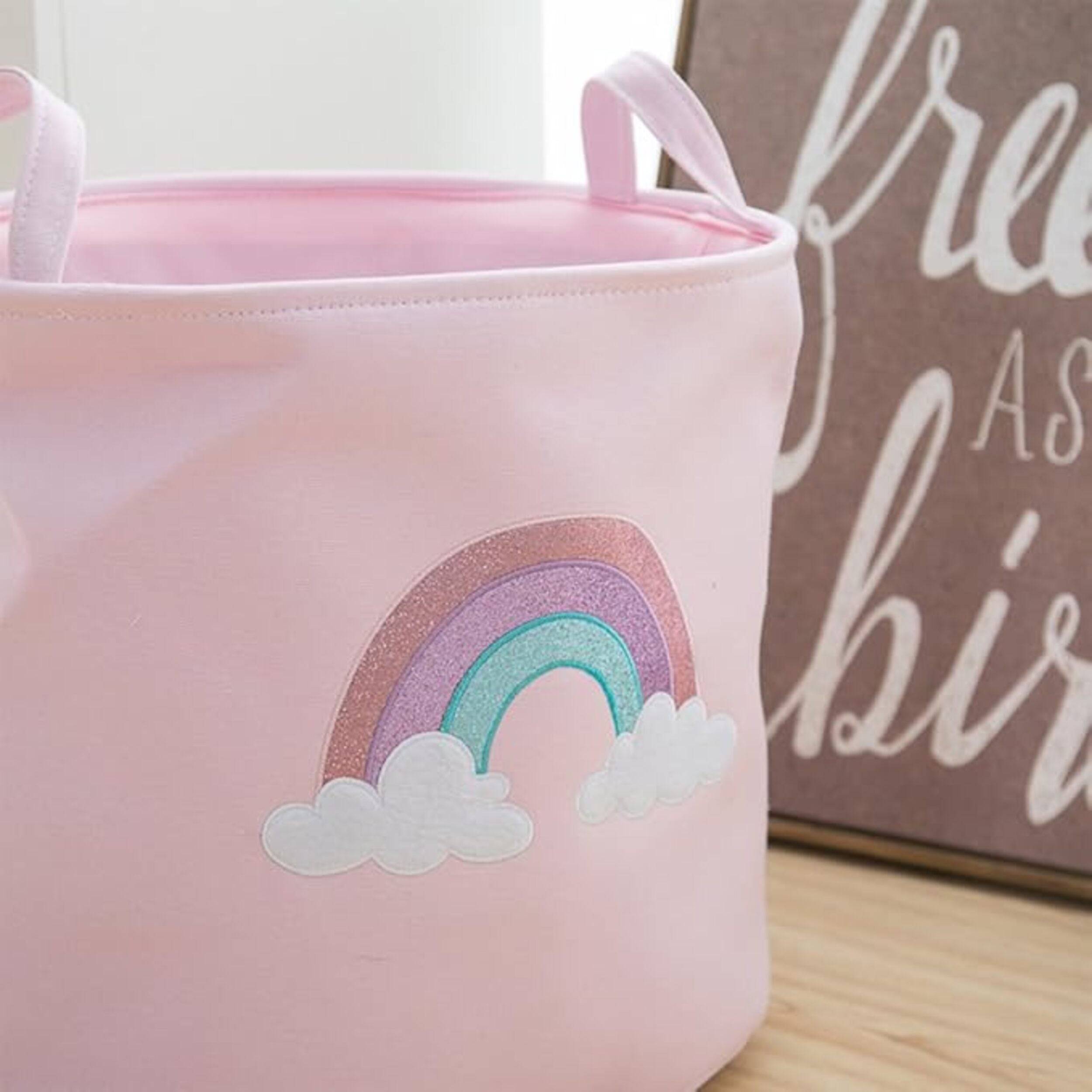 This is a cylindrical, foldable fabric storage basket designed for children, featuring a soft pink color and a prominent rainbow applique with clouds. It serves as a laundry basket or general storage container. The basket is made of a soft, collapsible material, likely cotton or a cotton blend, and has two fabric handles. The key design element is the rainbow applique, adding a whimsical and colorful touch. The dimensions provided in the image are 40cm height, 33cm width (diameter), and 40cm depth, indicating a decent size.