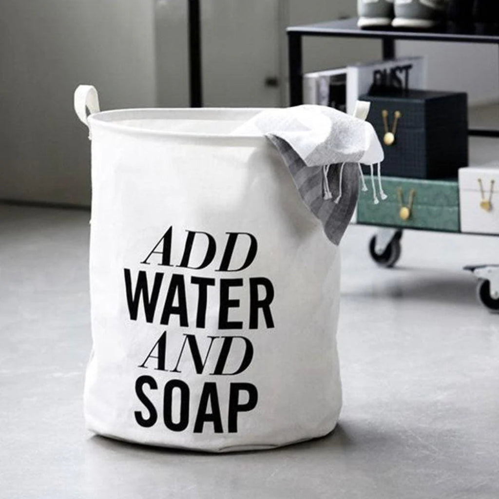 The "Wash Me!" Reminder Foldable Laundry Basket is a practical and stylish storage solution for any home. It features a cylindrical design with two sturdy handles for easy carrying and a bold "Wash Me!" message printed on the front. The basket is crafted from a durable, lightweight fabric, likely cotton or canvas, and is designed to fold flat for convenient storage when not in use. Its neutral color and minimalist design make it suitable for a variety of interior styles.
