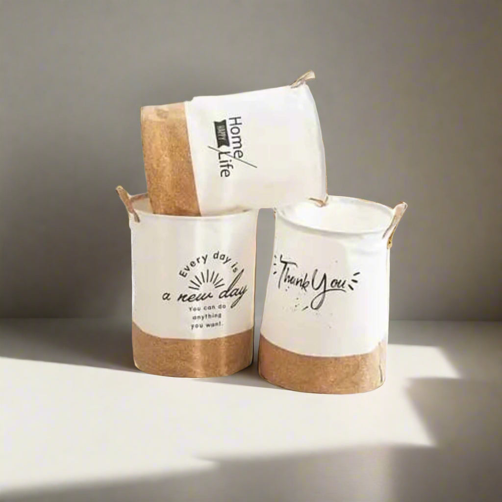 This is a cylindrical, foldable laundry basket featuring a two-tone design with a light-colored upper section and a textured, natural-looking lower section. It has an inspirational message printed on its upper section. The basket is collapsible and features rope handles for easy carrying.